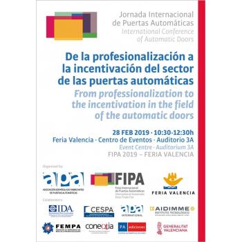 El próximo 28 de febrero, en el marco de FIPA 2019, a partir de las 10:45 de la mañana, tendrá lugar en el Centro de Eventos de Feria Valencia la JORNADA INTERNACIONAL DE PUERTAS AUTOMÁTICAS, con el título genérico: DESDE LA PROFESIONALIZACIÓN A LA INCENTIVACIÓN DEL SECTOR DE LAS PUERTAS AUTOMÁTICAS. Pueden inscribirse en la web de la Jornada.